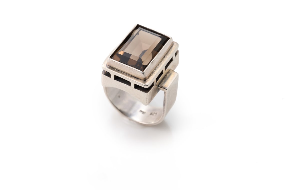 set in an architectural modernist design a tube-set emerald-cut smoky quartz weighing approximately 6.32 ct, on a flat band, sterling silver, stamped 'MR', size K 1/2, total weight 9.00 grams