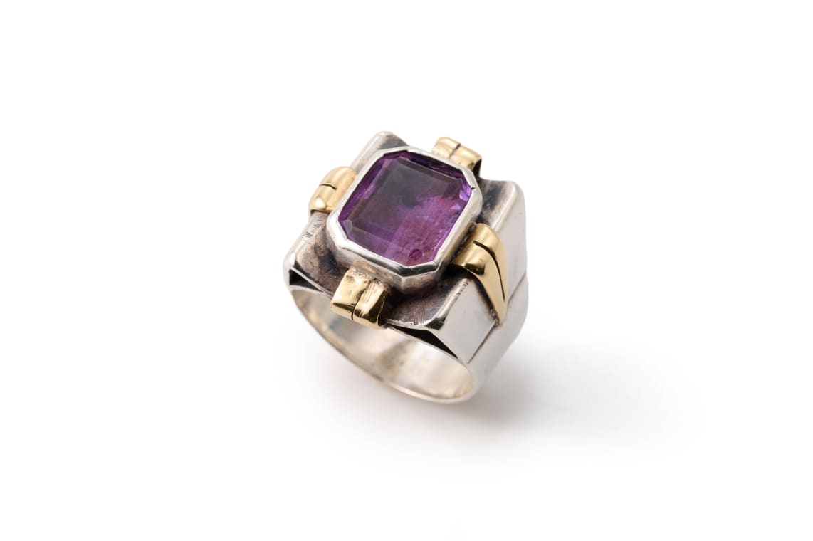 centred in the swaged rectangular design, a tube-set emerald-cut amethyst weighing approximately 3.40 ct, shouldered by yellow gold accents, on a tapering flat band, silver, stamped 'MR', ring size K 1/2, total weight 9.7 grams