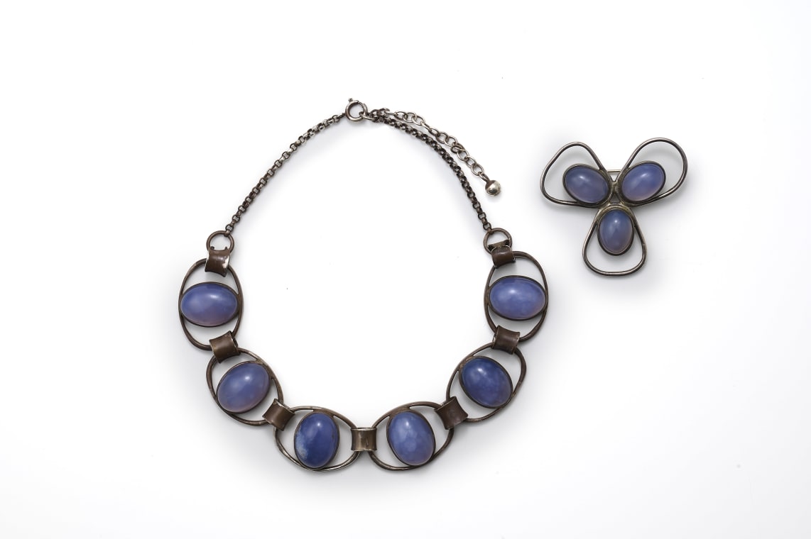 with tube-set oval cabochon-cut chalcedony, connected by large oval links, attached to a belcher chain, in sterling silver, length of necklace approximately 40cm, total weight 60.00 grams; Brooch, composed of three oval cabochon-cut chalcedony, bordered by wire petals, brooch pin finding, stamped 'E.FREY', width approximately 5.3cm, total weight 20.00 grams