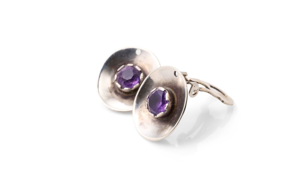 centred a scalloped tube-set round-cut amethyst weighing approximately 1.00ct, on domed oval discs, with clip-on findings, silver, stamped 'Jobst', 925, length approximately 2cm, total weight 7.70 grams