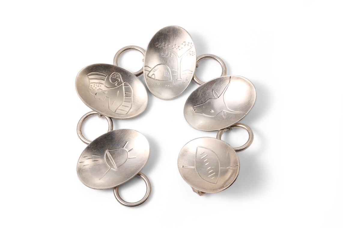 five oval discs etched with African-inspired motifs, connected by large round links, a hook clasp, sterling silver, stamped 'Haglund South Africa', length approximately 17.5 cm, total weight 41.20 grams