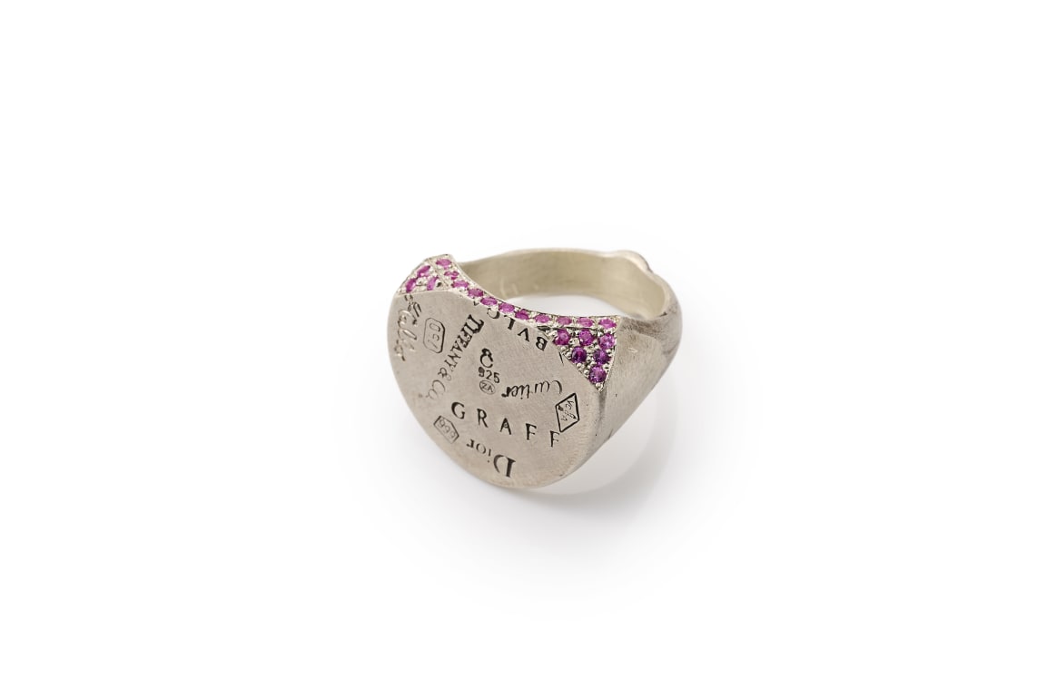 roughly pavé set lab-grown pink sapphires in sterling silver, stamped with luxury jewellery logos, inscribed with maker's initials, ring size P 1/2, total weight 16.9 grams