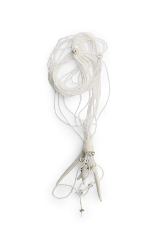Marlene de Beer harnesses the expressive potential of non-precious materials such as porcelain, glass (including vitreous enamel), and sisal, creating a phenomenological response to her lived experiences. Her porcelain neckpieces, incorporating indigenous thorns collected from local trails, embody contrasts of fragility and strength, evoking themes of protection, suffering, and belonging.