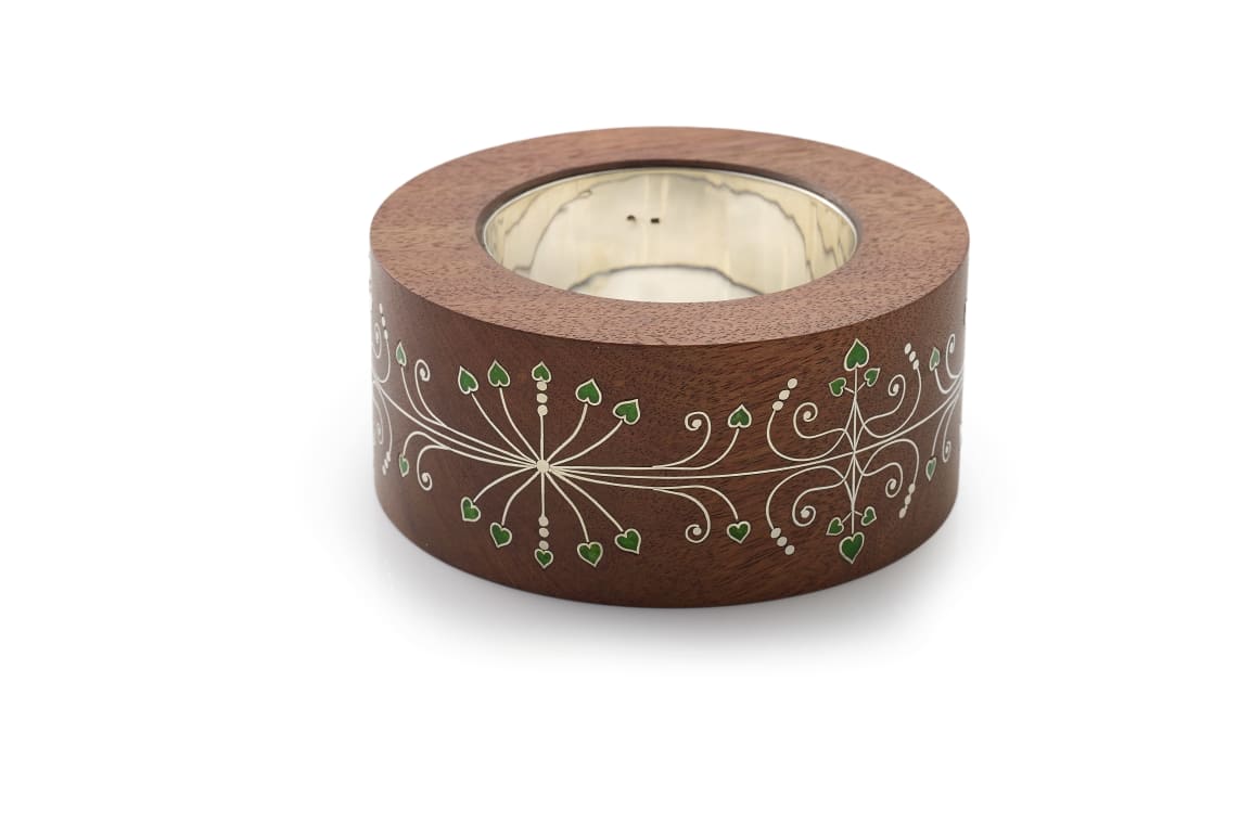 fine silver and enamel inlay in rosewood, with a sterling silver sleeve, inner diameter approximately 64mm, total weight 257 grams