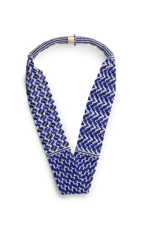 Growing up surrounded by my mother’s collection of Delftware, the iconic blue-and-white motifs left a lasting impression on my visual memory. Now living in Durban, KwaZulu-Natal, South Africa, I find my creative practice deeply shaped by the region’s rich heritage of craft beadwork and Shweshwe cloth design. This body of work, Study in Blue, draws from these layered influences—much like the way fabric is stitched together in my mother’s quilt work. In this series of brooches and neckpieces, I adapt traditional Shweshwe patterns to suit the Botsotso stitch, a linear beading technique predominantly used in the pieces. The process of beading becomes a way to weave personal narrative with cultural memory, embodying a hybrid South African identity. Through material, motif, and repetition, these works explore the intersections of heritage, memory, and identity.