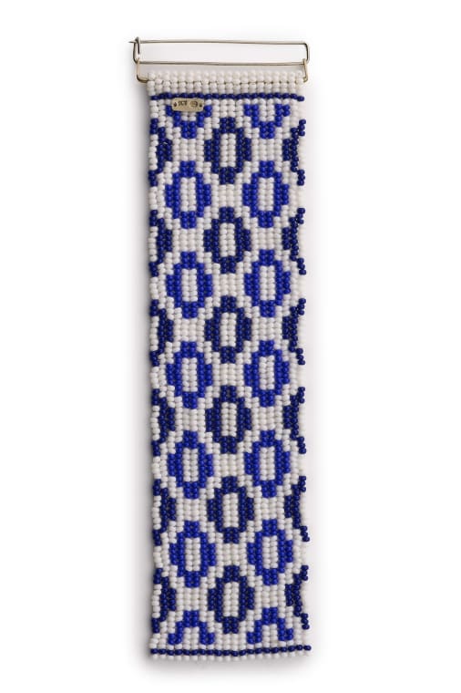 Growing up surrounded by my mother’s collection of Delftware, the iconic blue-and-white motifs left a lasting impression on my visual memory. Now living in Durban, KwaZulu-Natal, South Africa, I find my creative practice deeply shaped by the region’s rich heritage of craft beadwork and Shweshwe cloth design. This body of work, Study in Blue, draws from these layered influences—much like the way fabric is stitched together in my mother’s quilt work. In this series of brooches and neckpieces, I adapt traditional Shweshwe patterns to suit the Botsotso stitch, a linear beading technique predominantly used in the pieces. The process of beading becomes a way to weave personal narrative with cultural memory, embodying a hybrid South African identity. Through material, motif, and repetition, these works explore the intersections of heritage, memory, and identity.