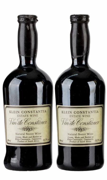 '93 in squat 500ml bottle moulded on the legendary 18th Century shapes; deeper gold-tinted than some previous, it has the clear-flavoured, ripe sunshine intensity of delicate Muscat. But without botrytis. Constance might not overpower, but it has its own riveting, complex minty/eucalyptus, sweet lemon-honey impact, with an obvious but more restrained than usual Muscat topping. French tourists who know their history arrive at the cellar asking for 'Le Vin de Napoleon'. It's the most quickly sold out, severely allocated Klein Constantia label.' - Platter's SA Wine Guide 1998, Superior Cape Wine