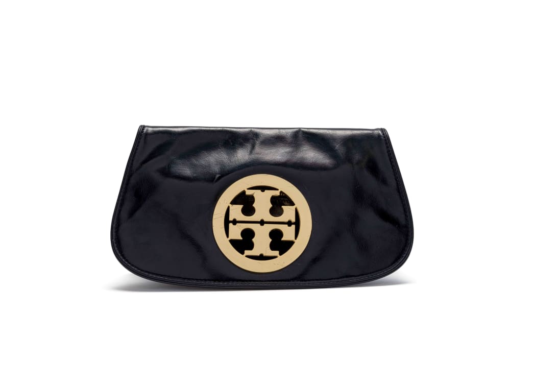 This clutch merges classic sophistication with modern flair. Its minimalist form is punctuated by an oversized gold-tone logo clasp, which serves both as a functional closure and a decorative focal point. Its clean lines and refined silhouette make it perfect for evening wear, while the prominent logo adds a distinctive touch that elevates the overall aesthetic, reflecting the brand’s ethos of accessible luxury.