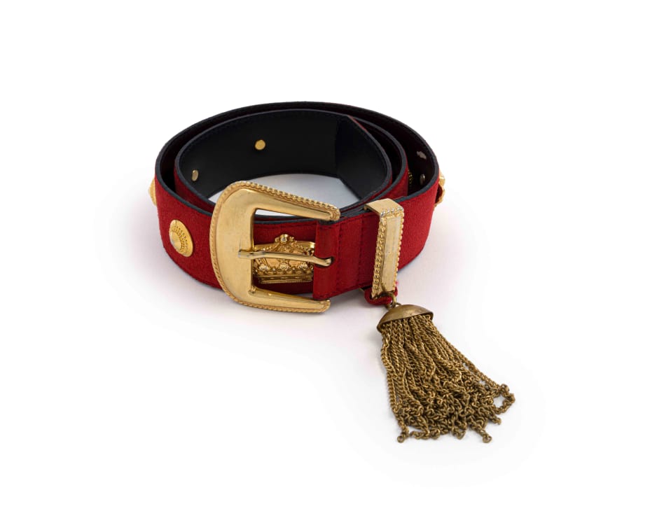 This belt stands out with its bold colour and fine craftsmanship. Rich red suede is set off by gold-tone hardware, including stud detailing and a crown motif, with an arresting contrast between material and metal. A statement accessory by design, it elevates both casual and more formal outfits while maintaining quality and longevity.