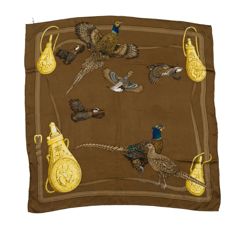 A Vintage Pure Silk Scarf with Pheasant Illustrations on a Brown Ground