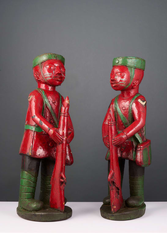 Sometimes described as transitional or hybrid art, colon figures preserve the formal balance, stylisation, and composure typical of indigenous sculpture while incorporating new symbols of foreign power and prestige—pith helmets, military or bureaucratic uniforms, tailored suits, shoes, watches, bicycles, and smoking pipes.