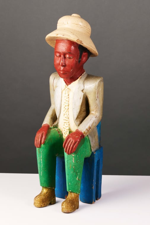 Sometimes described as transitional or hybrid art, colon figures preserve the formal balance, stylisation, and composure typical of indigenous sculpture while incorporating new symbols of foreign power and prestige—pith helmets, military or bureaucratic uniforms, tailored suits, shoes, watches, bicycles, and smoking pipes.