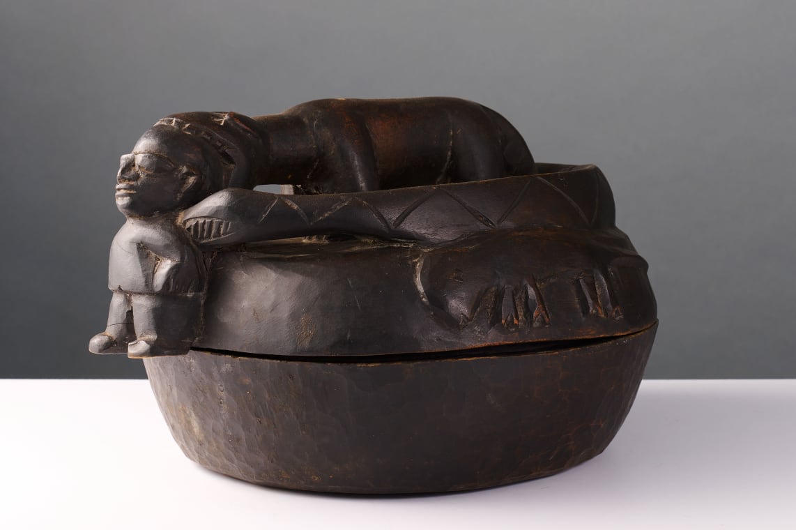 Kuba wooden box with geometric pattern and tortoise decoration, DRC