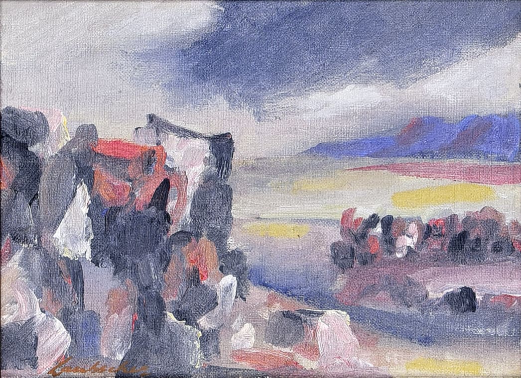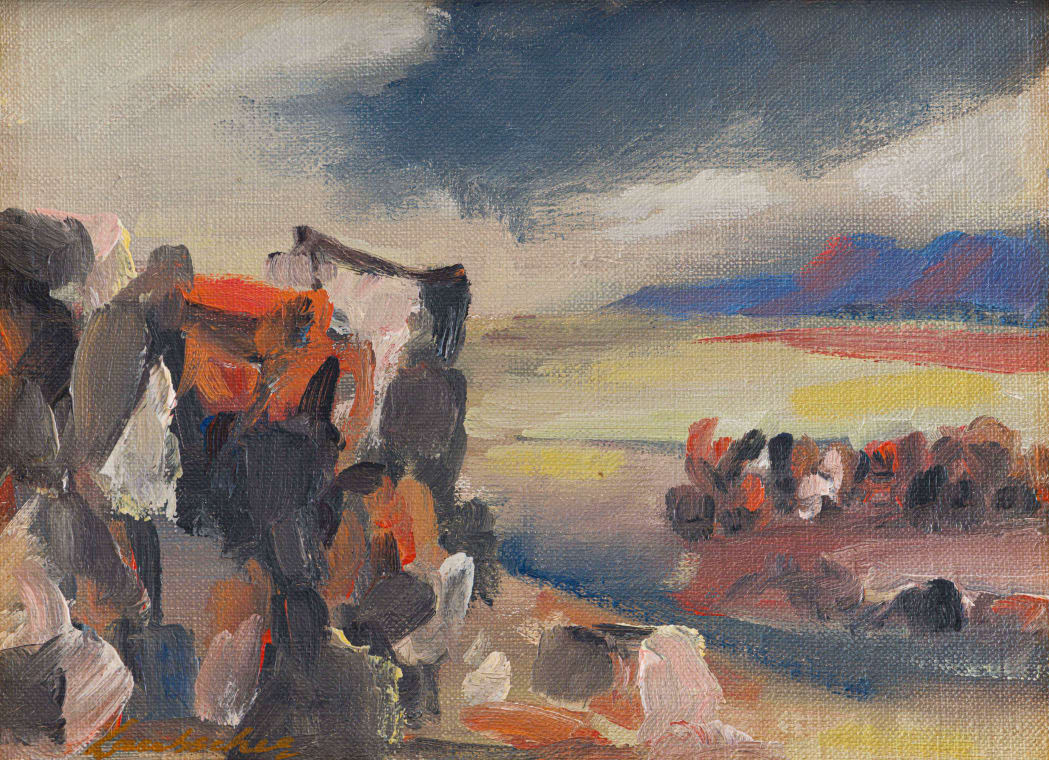The Kouebokkeveld is a mountain range in the Western Cape, an area familiar to the artist and a subject that recurs frequently in his work. The high mountains make this one of the coldest places during the winter months and this painting depicts such a day, a remote spot with mists swirling around the rocks in the foreground, the extensive landscape dropping away behind, and weak sunlight attempting to penetrate the cloud-streaked sky.