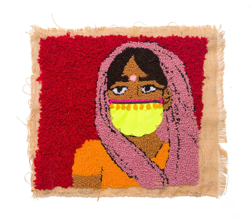 ribbon, polyester and acrylic yarn on hessian