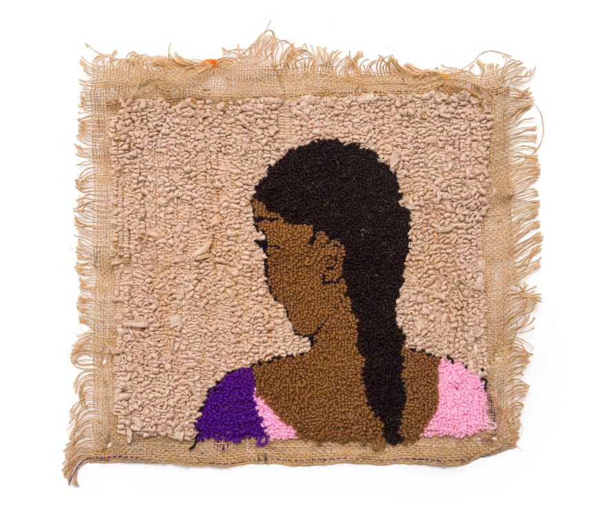 ribbon and acrylic yarn on hessian