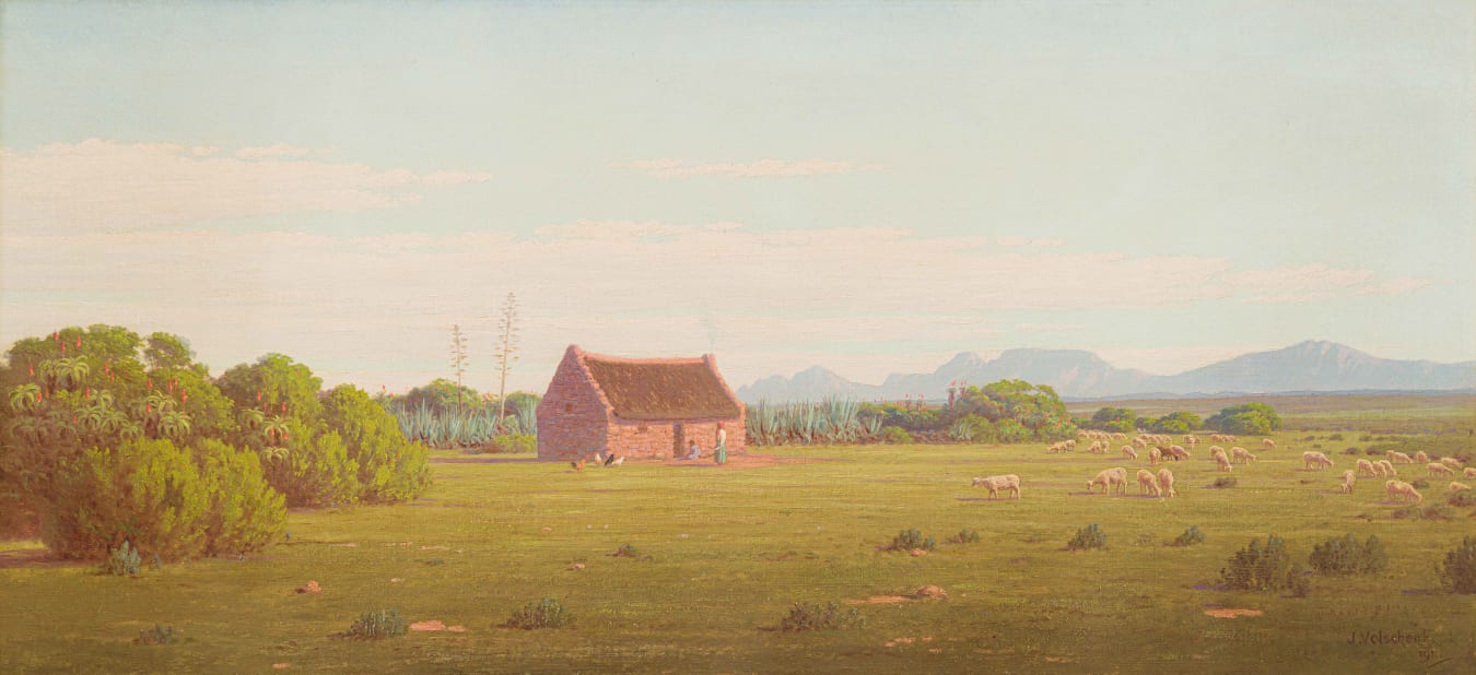 'Volschenk approached the task of celebrating his home landscape without theory or polemic. His aim was purely to record the information offered by his eyes. Structural design, as such, did not concern him. The composition of his paintings was established by the view itself. His faithful descriptions read like random snapshots filtered through a rose-tinted lens. As his skill for rending the effect of light grew, he increasingly romanticized his portrayals.'