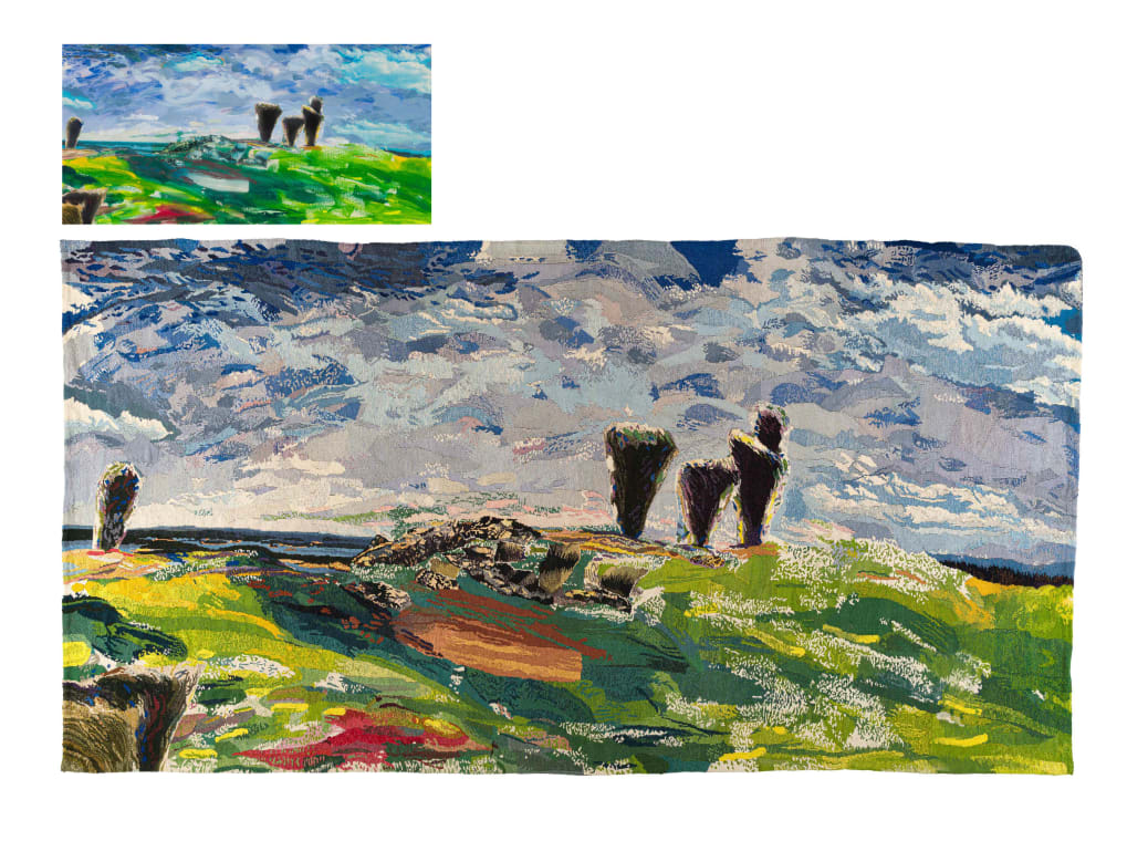 In the present lot, the landscape depicted unfolds as a rolling, undulating terrain that captures the essential character of the South African countryside. It emphasises the expansiveness of the open field with a composition that engages both space and atmosphere. The sky, rendered through subtle blue and white woven threads, creates a cloudscape that permeates more than half of the tapestry. The tactility of the woven surface adds a dimensionality that painting cannot achieve, creating a felt landscape with gentle rolling of the terrain that creates a rhythmic flow across the work.