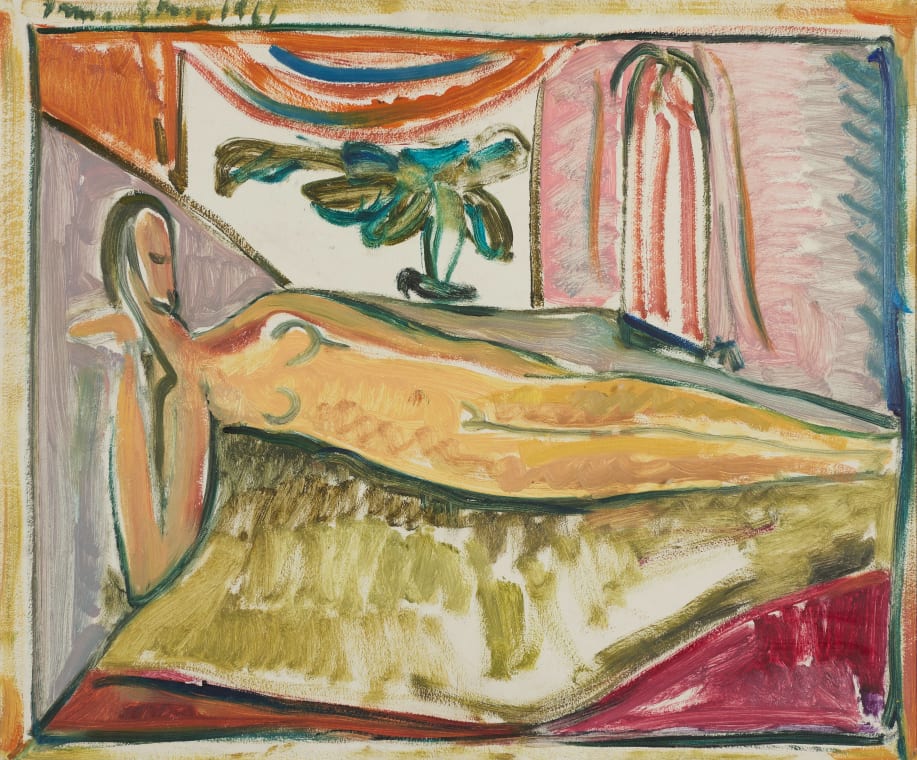 The catalogues for two exhibitions in 1961 devoted to Stern’s new Spanish work list only one oil depicting a beach scene and no nudes. The style of the present work is more closely aligned with a later series of abstracted nudes from 1962, produced during a second visit to Alicante, in which Stern similarly presents a graphically simplified female figure within a painted picture frame. The economy of means underpinning this new work has its origins in her nudes of the 1950s, when she came to favour “simplified linear description”4 over the naturalism and specificity of her nudes from the late 1940s.