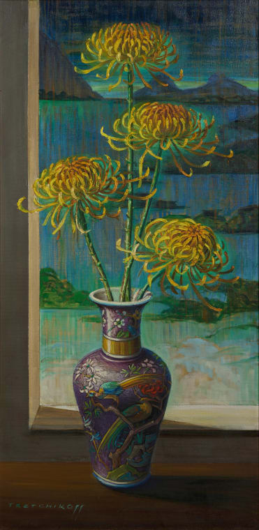 Tretchikoff described his style as 'symbolic realism'. And nowhere was this more prominent than in his flower studies. He first painted flowers in Java, enchanted by the rainbow-like colours of the cannas in his garden. But his fascination with flowers had probably started much earlier, in the Far East. In Chinese culture, each flower symbolises a quality or idea. Flowers are always found on Buddhist altars. The graceful shapes of Chinese vases, emblems of harmony, reproduce the curves of a woman's body.