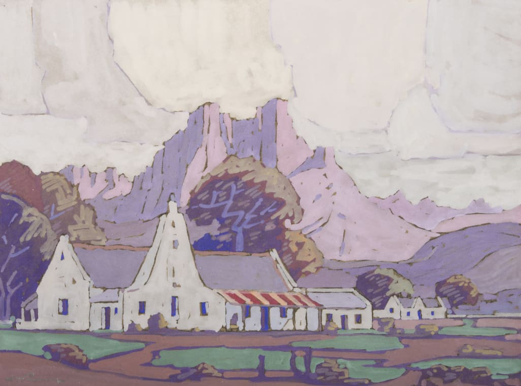 The work is distinguished by its subtle colour variety and the angular, fragmented elements found in both the Cape Dutch architecture and the peaks behind. Pierneef’s typical palette of lavenders, purples, and greens is complemented here by candy-coloured oranges and reds on the canopied roof. The interlocking clouds further suggest an architectonic sensibility, mirroring the decorative quality he saw in the mountain peaks.