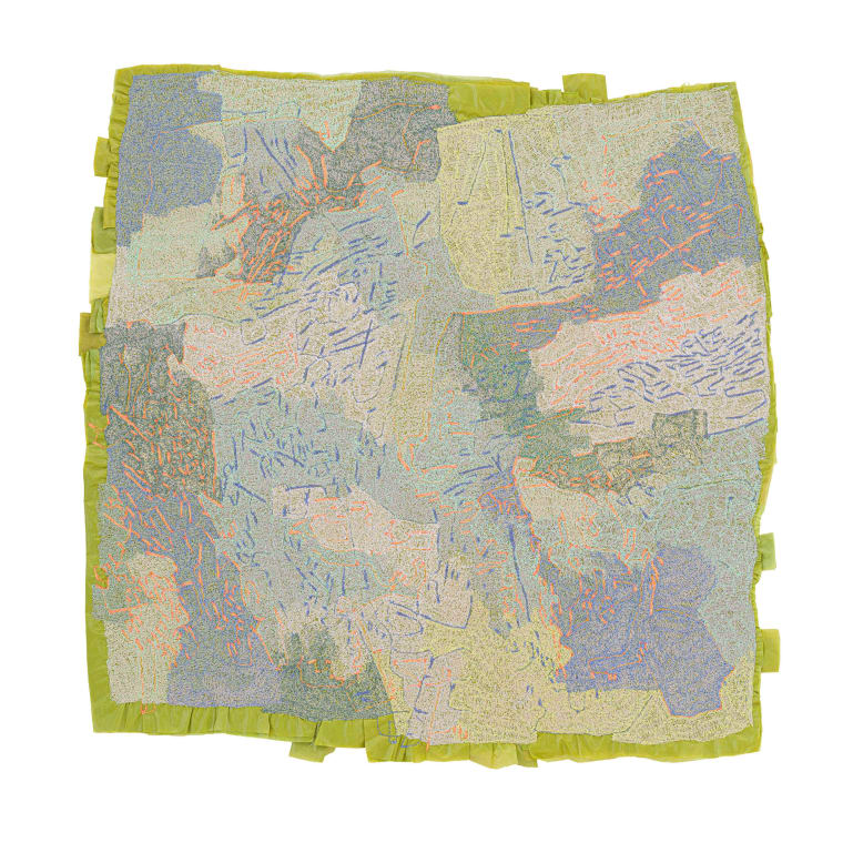 Amy Rusch (b.1990) is an artist working across disciplines and mediums. She’s been exploring a vibrational expression of mark-making, using stitched thread into layers of found plastic bags. The layers of plastic, connected by the motion and soundscape produced by the machine, communicate aural and material aspects of our modern culture. The threads are an attempt to link and comprehend millions of years of layered stratigraphic time. Her current body of work is informed by ocean crossings, archaeological excavations and microscopic studies of the living world. Her practice can be seen as tracings, translations or mappings of sensory lived – body experiences, becoming multisensory coalescences of sound, vibration, line and colour.