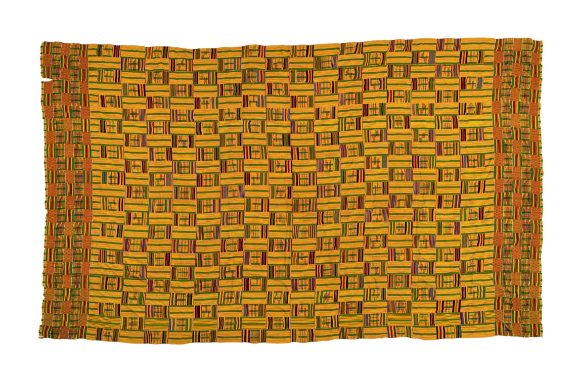 Elaborate cloths, such as this one, were woven only on commission from members of the royal and chiefly elite. The warp design had to be drawn from the repertoire of designs approved by the Asante kings. Each design has a title that reflects either the region in which the design originated, the image that the design evokes (back of the tortoise, guinea-fowl feather), an aspect of Ashanti culture or a proverb: Money attracts blood relatives, News of good deeds does not travel far.