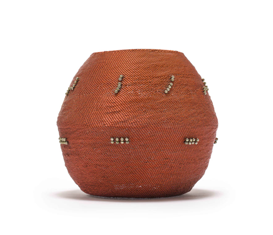 This vessel was woven as part of an experimental project, allowing the weavers to express themselves with their choice of pattern and beads.