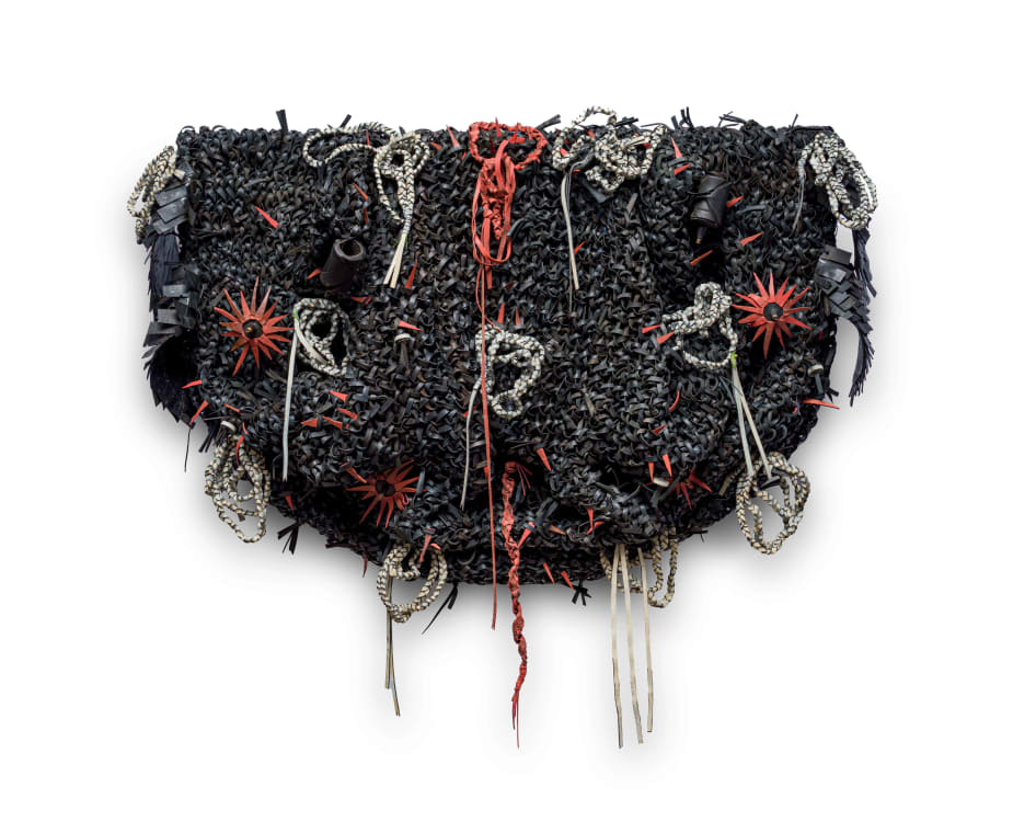 Patrick Bongoy is a multidisciplinary artist from Kinshasa, Democratic Republic of the Congo, who draws on the skills of traditional basket-making by weaving strips of reused tire rubber and other materials into complex, layered relief sculptures.