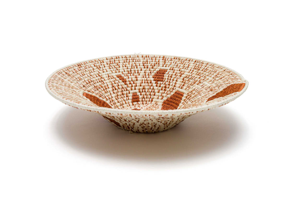 Instead of weaving their usual geometric and symmetrical patterns, these skilled artisans from Tintsaba have experimented with something new. They have taken the enamelware bowl, which holds such resonance within the African home and landscape, as a starting point. The random rust and wear of these discarded bowls, which are often found on the periphery of clean-swept yards of rural homesteads, have been meticulously copied into the sisal medium, sparking a dynamic conversation around traditional artistry, history, and material culture.