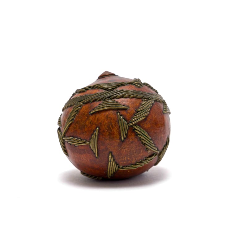 Delicate decorative and geometric patterns are created by inserting short pieces of brass or other wire, as staples of varying lengths, into the surface of the container. These snuff gourds were treasured personal possessions, used for holding and sharing powdered tobacco — a practice that has been part of southern African life since tobacco’s introduction in the 16th century.