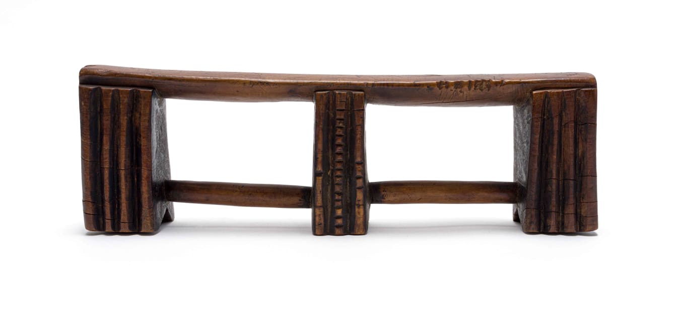 Working in the first half of the 20th Century, Woya Miya was a well known carver from Etonyaleni near Bergville in the Drakensberg region. This richly patinated headrest has three subtly notched legs joined by round buttresses. Clean and simple, the pattern created by fluting on the legs is only broken by a serrated ridge on the thinner middle leg. Purchased by original owner, MaZwane Nkala, from the carver in the late 1930s.