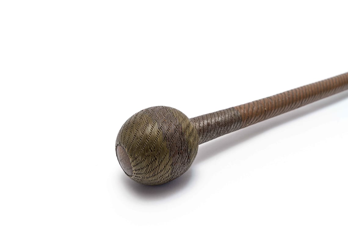 Key traits include the spherical wooden head and a shaft wrapped in tightly coiled decorative wire. The presence of three-tone metal wire—typically combinations of brass, copper, and iron—strongly aligns with Zulu traditions, where two- or multi-tone wire patterns were intentionally used to denote rank or distinction. Elaborate wirework reflected both the bearer's prestige and the artisan's skill. Among the Zulu, such items primarily served as ceremonial objects and rank insignia, not weapons. Carried by chiefs or military leaders, they signified authority and status during rituals and public events.