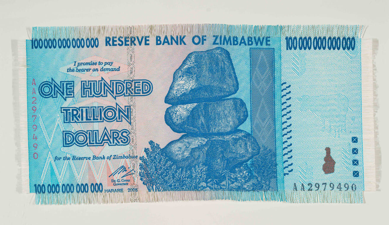 The present lot, Z$100 Trillion, is constructed through the hand-weaving of archival inkjet prints of the currency, a process that foregrounds themes of value, belief, and material fragility. Once invested with political and economic promise, the note ultimately became worthless amid extreme inflation. Isolated in this work, it draws attention to the precarious systems underpinning money, trust, and national identity. The image oscillates between absurdity and tragedy, revealing how swiftly material value can collapse when collective confidence is lost.