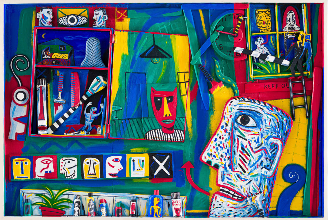 The present lot, Close Shave, exemplifies this approach. It is a mixed media work depicting a tense interior scene in which figures, objects, and symbols compete for attention. Its bright colours and bold lines heighten a sense of pressure and unease. The title hints at a narrow escape or looming danger, echoed by the large profile in the foreground, which appears watchful and imposing. Ladders, tools, and fragmented faces suggest themes of control, surveillance, and performance. Beneath its playful surface, the work reflects on vulnerability, power, and the subtle anxieties embedded in everyday life.