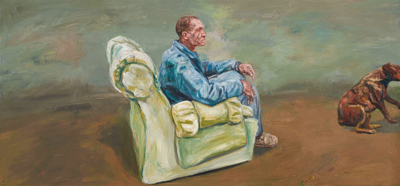 "Louw is part of a younger generation of South African artists who have re-engaged with figurative painting in a very robust and direct manner. Louw's figures are locked into indeterminate spaces of bleak isolation, rendered with dense, crusted pigment that magnifies and monumentalises the sense of exhausted existentialism of the work. In this painting, the dog, a symbol of companion-ship and fidelity, is reduced to a crudely rendered lump of flesh that teeters off the edge of the picture plane while the figure, almost overwhelmed by his clothing, stares into the distance."1