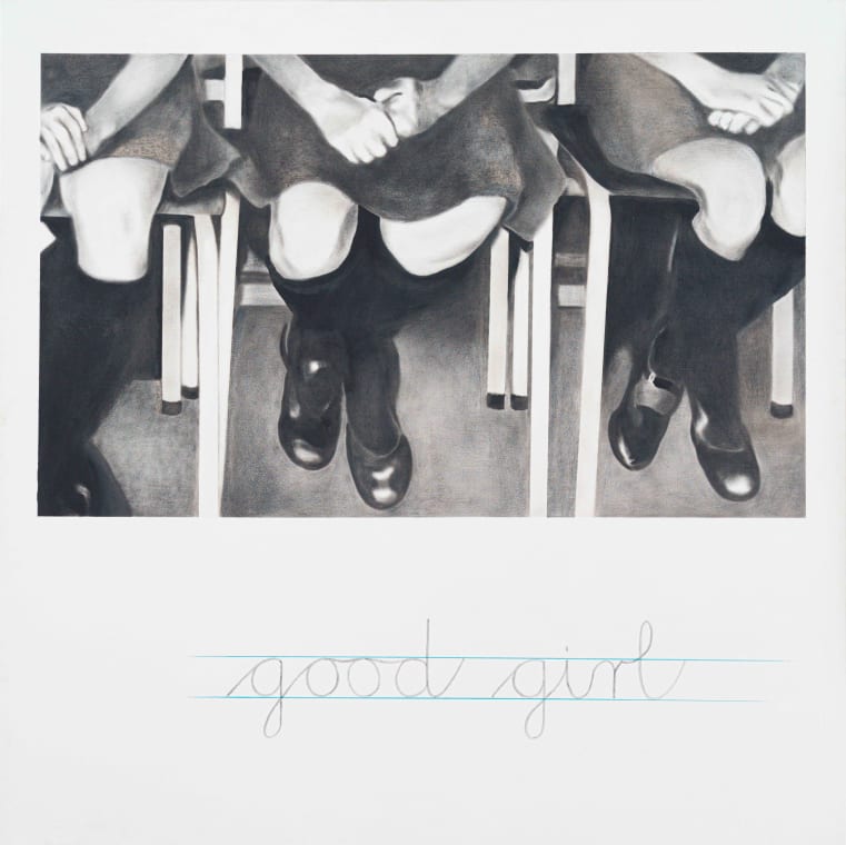 In Good Girl, only the legs of seemingly school-aged girls are depicted. The composition is largely empty, with the figures occupying approximately half of the canvas’s white space. Across the lower portion, the words “Good Girl” are inscribed in a style reminiscent of classroom chalkboard writing. The phrase, contextually loaded, can shift dramatically in meaning depending on tone and relational dynamics. Here, Hipper explores the complex interplay of power, authority, and vulnerability through a restrained and tautly rendered image. The focus on the anonymous lower bodies, with knees neatly positioned and hands clasped, combined with the expressive qualities of charcoal, positions the viewer in a deliberately uncomfortable, contemplative stance. While nothing is explicit, the work invites reflection on the psychology of observation, consent, and the eroticization of authority within cultural frameworks. 3