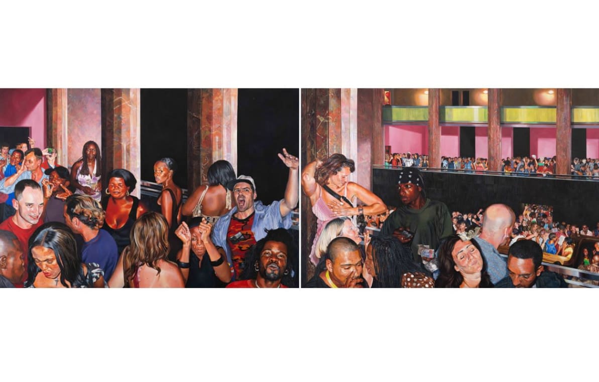 This ambitious diptych formed part of Deborah Poynton’s 2006 exhibition Safety and Security, which included three new multi-panel paintings of crowds assembled at specific Cape Town sites, engaged in ritualised forms of behaviour. The present work is the most declaratory of the group. It depicts a mixed-race gathering partying in the former banking hall of Mutual Heights, the Art Deco landmark that was once the tallest building in Africa. The grand interior, with its triple-volume ceiling, marble columns and geometric detailing, provides a charged setting for a scene of collective abandon and private absorption.