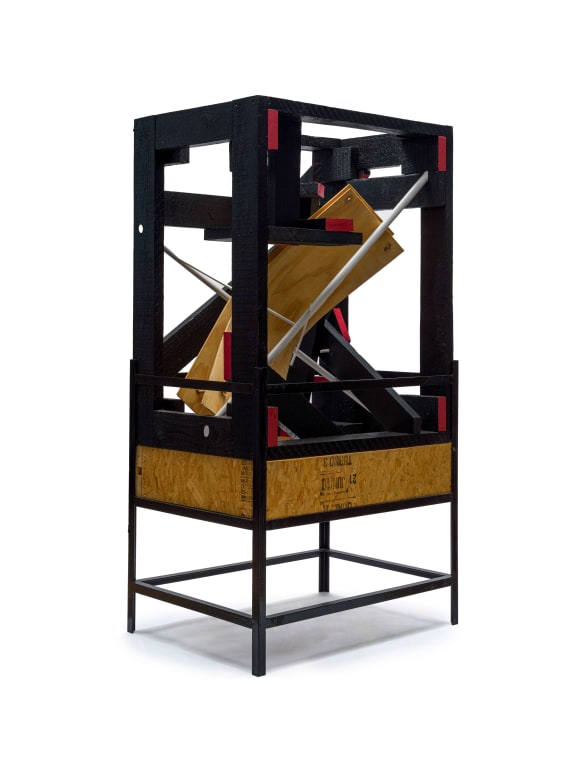This sculpture was exhibited in Black Cargo (2013), a striking body of work that brought together paintings, sculptures and site-specific interventions. The exhibition examined black subjectivity in relation to forced migration, focusing on states of suspension, adjustment and survival within unstable environments. Lattices of intersecting black lines, their projecting ends recalling the modernist furniture of Gerrit Rietveld, recur in his paintings and sculptures. Works also quoted one another, the painting Fragile Cargo IV: Studio Study III portraying this lot.
