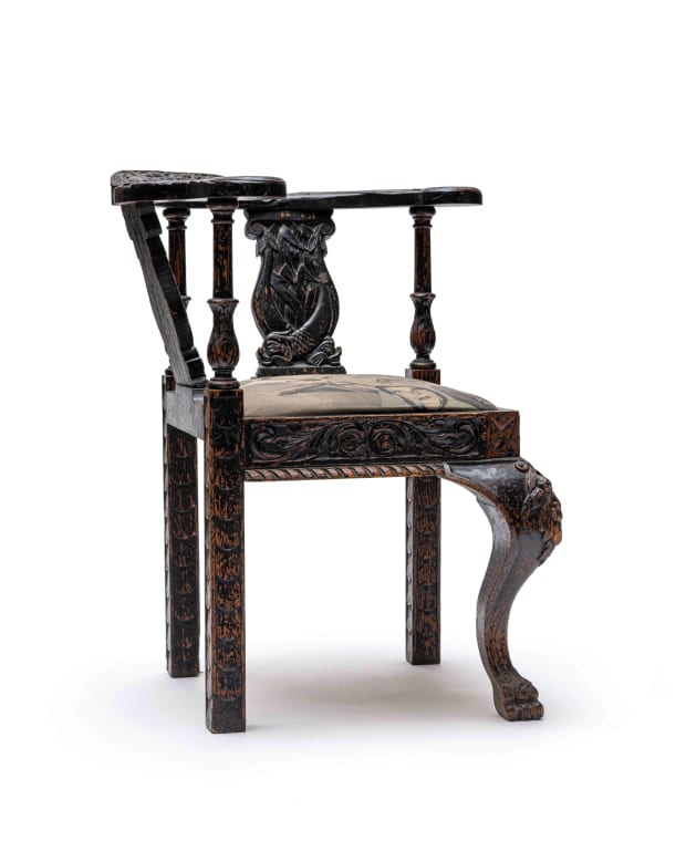 screenprinted fabric upholstered to corner chair