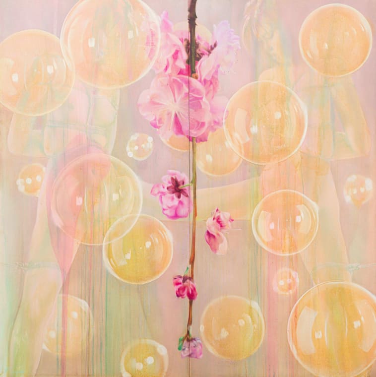 The present lot, Blossoms, Bubbles and Bondage II, is a two-panel oil on canvas work which was produced during the artist's 'Post-Tokyo' period, in which she found inspiration from a trip to Japan in search of Sakura blossoms as well as the art of Kinbaku, the Japanese art of rope binding that emphasizes aesthetic form, tension, and emotional resonance.1