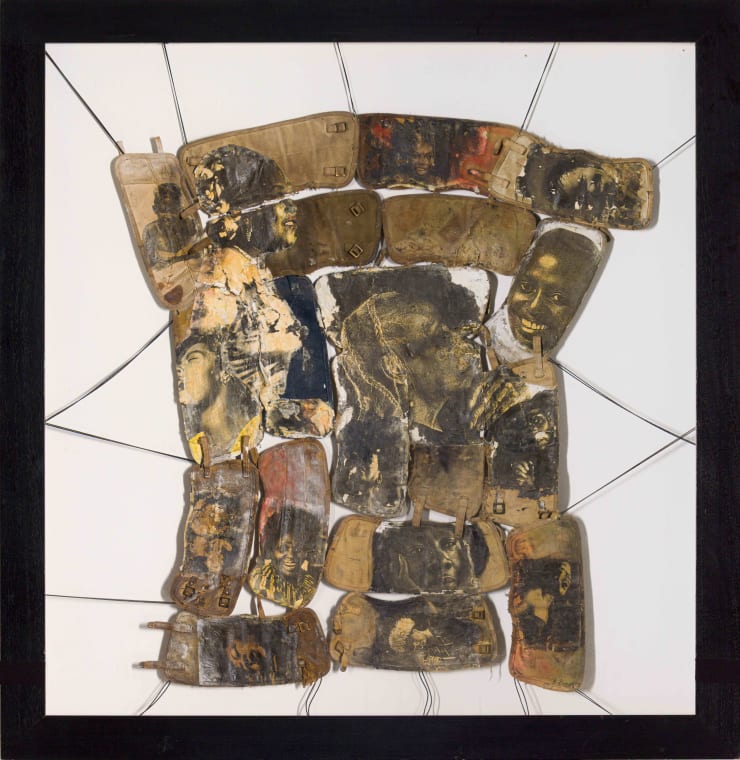 mixed media on found fabric, suspended behind Perspex