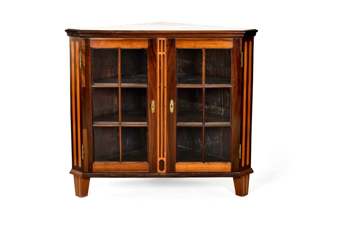 This corner cupboard is a good example of Cape country Neo-classicism. The uninterrupted straight lines, architectural design features, inlay and spade foot are all characteristic of this style period.