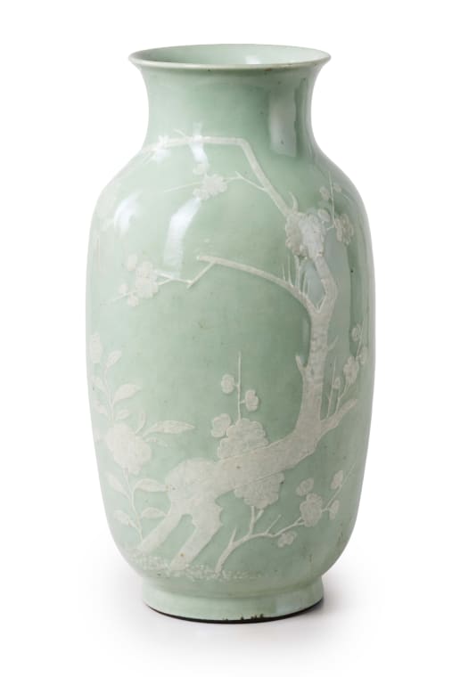 Porcelain with an almost cylindrical body, decorated with applied prunus branches in white slip and covered in a pale celadon glaze, possibly 18th century.