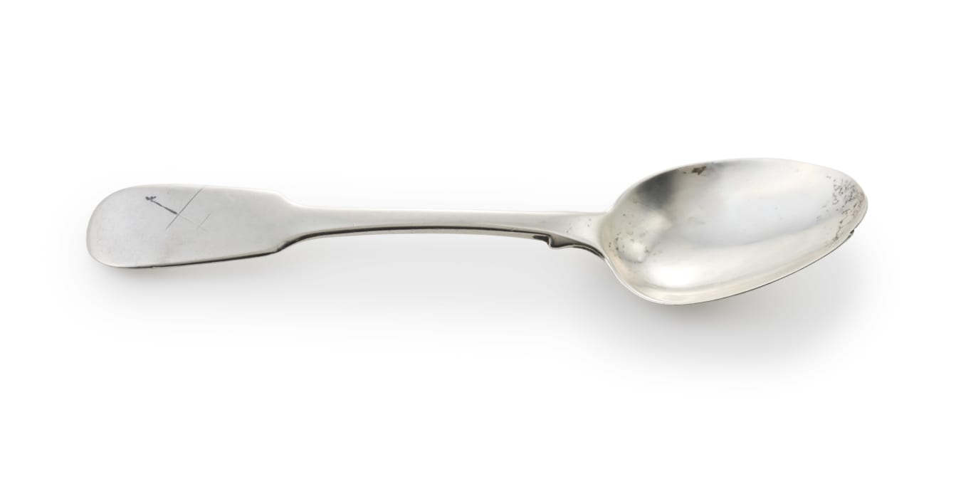 A Cape silver fiddle pattern serving spoon, Lawrence Holme Twentyman, c.1818-1837