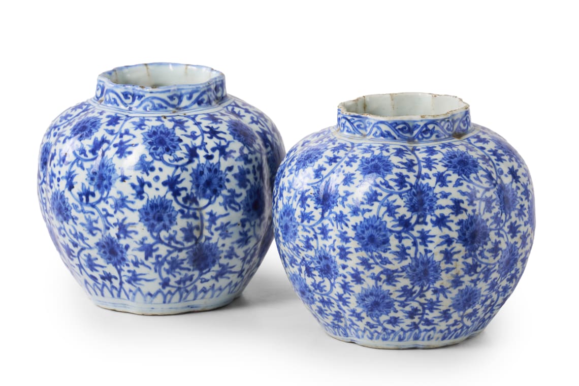 Of lobed globular form, each painted in underglaze blue with dense scrolling lotus. The lotus is a powerful symbol of purity and spiritual renewal in Chinese culture, as it blooms cleanly from muddy water and is closely associated with Buddhist ideals.