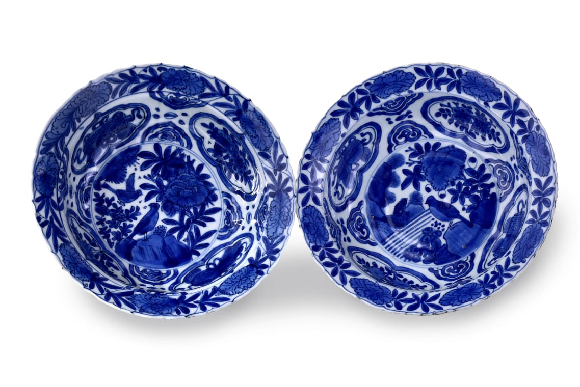 A pair of blue and white kraak porcelain bowls, each with a central medallion of birds among rockwork and foliage, symbols of harmony and longevity. The wells are divided into radiating panels containing floral sprays and auspicious objects. Barbed rims, bordered by peony and foliate scrolls, are characteristic of late Ming Jingdezhen export porcelain. Minor variations in tone and brushwork reflect the hand-painted nature of kraak ware.