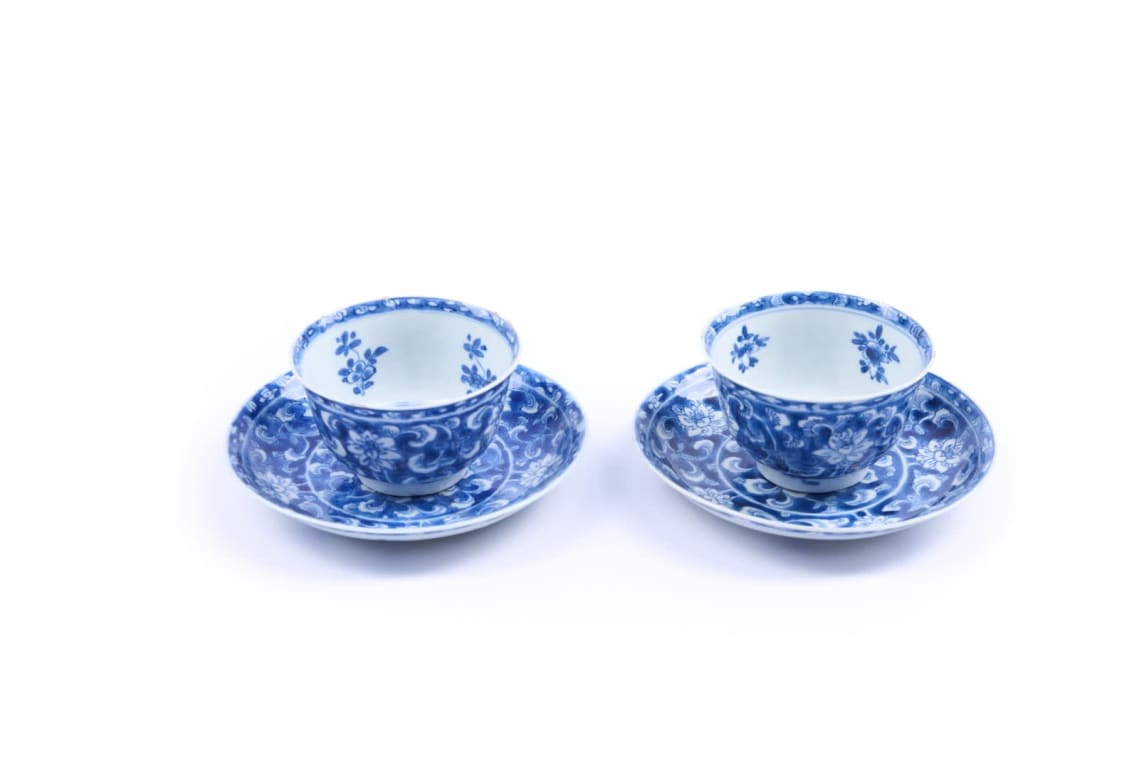 A pair of Chinese blue and white porcelain cups and saucers, Kangxi period, 1662-1722