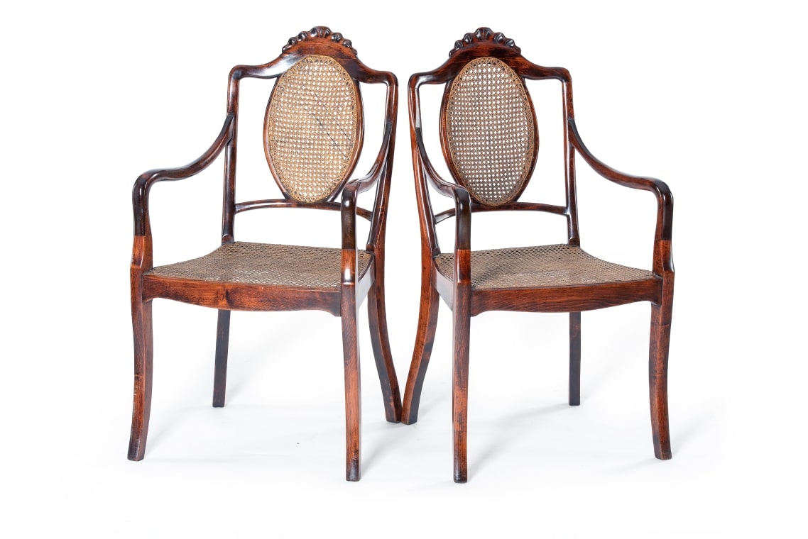 This style, which blends Neo-classical design with canework, was popular in the late 18th and early 19th centuries and exhibits elements of both the Georgian and Regency periods.