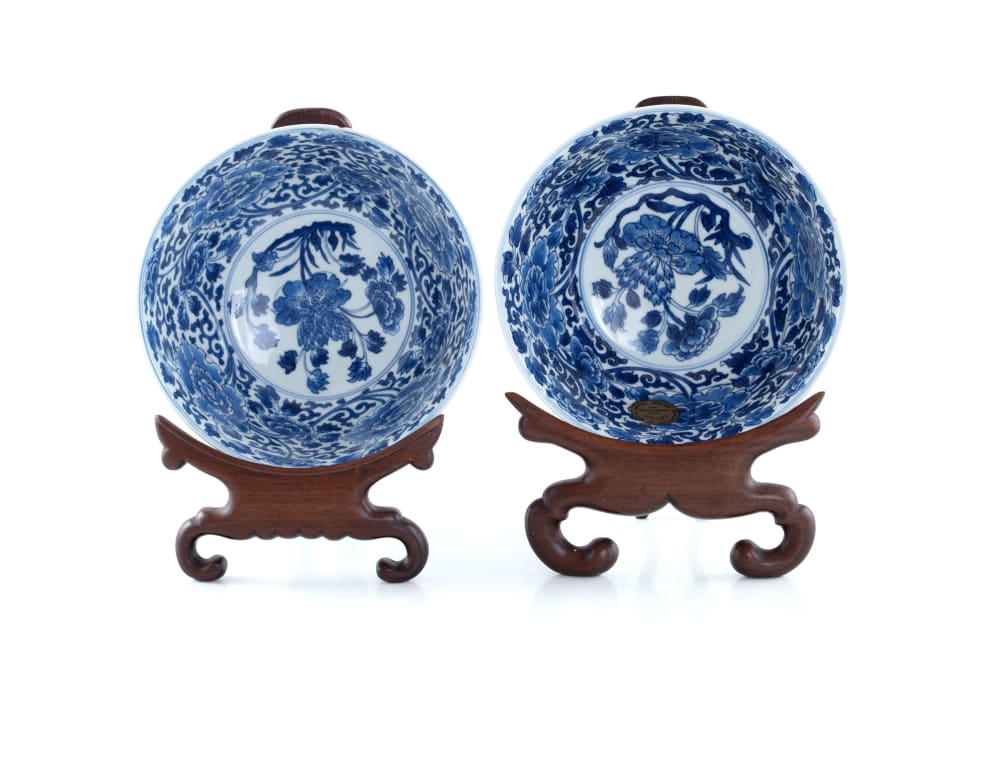 A pair of Chinese blue and white porcelain rice bowls on rosewood stands, Kangxi period, 1662-1722